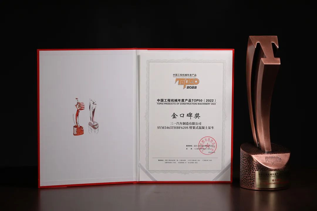 S系列62米混凝土泵车、SLZ4000原再生一体式沥青搅拌站、SSP90C-8摊铺机和SY412新一代轻量化搅拌车四款产品上榜,荣获中国工程机械年度产品TOP50的荣誉,S系列泵车更是获得其中的最高荣誉——“金口碑奖”。