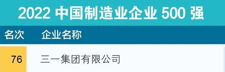 在“2022中国制造业企业500强” 中,好体育投注网站集团位列第76名,较上年度再度提升3个名次,稳居工程机械业第一。