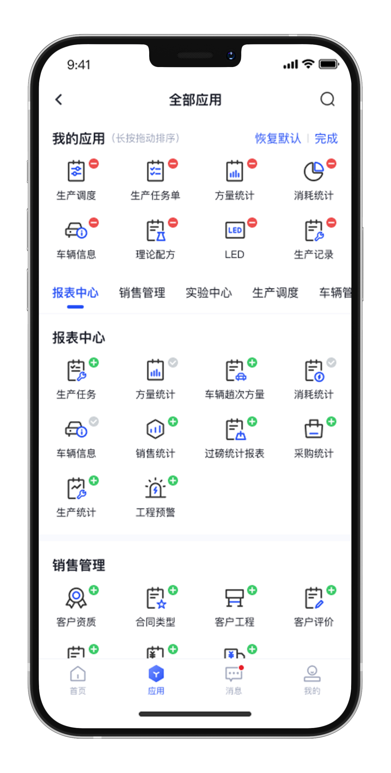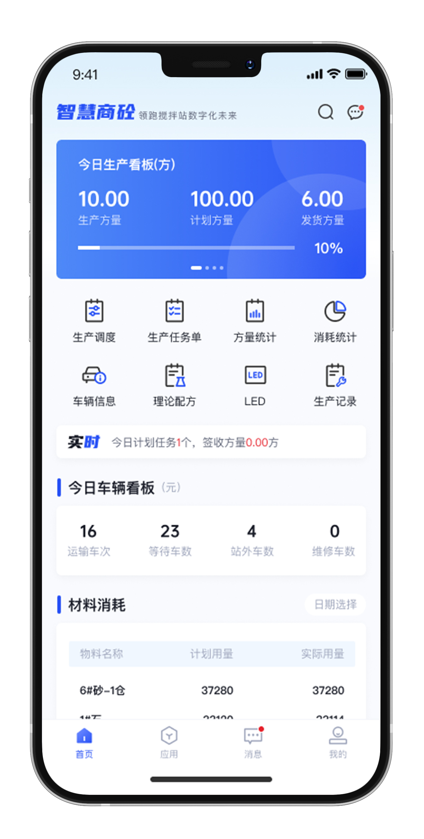 “站”是指站内移动端,提供给搅拌站内部人员使用,实现了在线签约、任务管理、配方管理、下发派车、车辆管理、地图定位、电子签收、报表查询、消息推送等功能。站内移动端提供搅拌站生产运营多种数据报表,如生产数据、消耗数据、运输数据、盈亏情况统计等,管理人员通过这些数据能够方便掌握搅拌站生产运营情况,加强对搅拌站的管控。