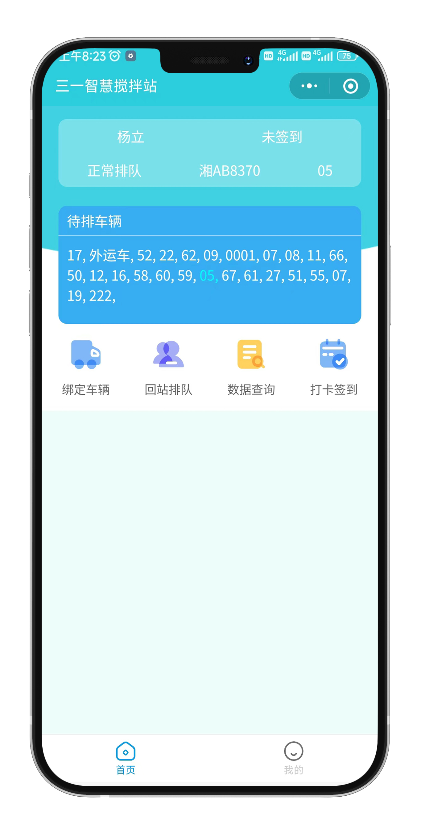 “运”是指司机端。站内司机使用移动司机端,可随时查看车辆排队情况,提高排队效率;可自主绑定车辆信息,打卡签到;可查看司机的出货单,运送完成时展示出货单二维码,搭配工地端完成出货单的扫码签收。