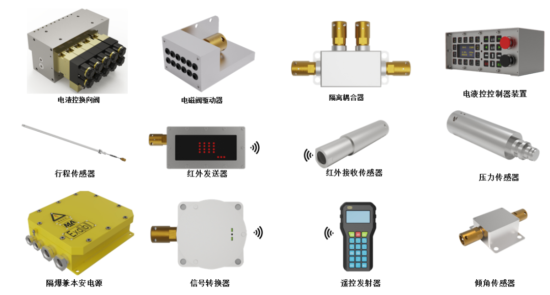 # 系统配置 # 液压支架电液控制系统由支架控制器、电磁阀驱动器、电液控换向阀、直流稳压电源、电源适配器、隔离耦合器、信号转换器、遥控接收器、红外线发射/接收器及压力、行程、倾角、接近等多种传感器组成。