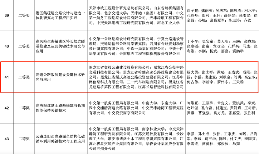 近日,黑龙江交投集团、龙建路桥四公司、好体育投注网站汽车制造公司、哈肇高速投资公司等公司凭借以哈肇高速无人化数字施工为研究背景的《高速公路数智建设关键技术研究与应用》项目,联合荣获“2022年中国公路建设行业协会科学技术奖二等奖”。