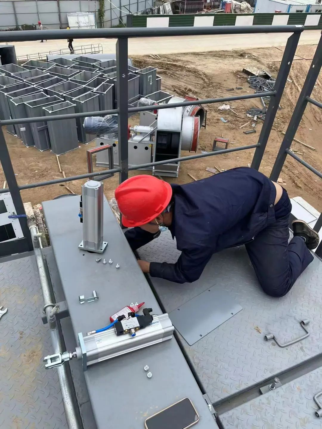 伴随着全国大范围降温,山东作为北方的沿海省份,降温明显,最低温已经降至零下。而沥青站高达几十米,上部操作平台风大灰多,给施工人员的安装调试及安全都带来了极大的不便。