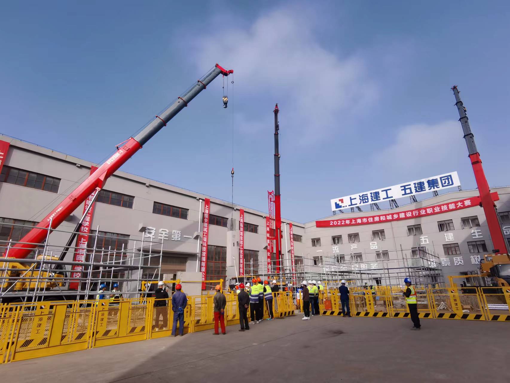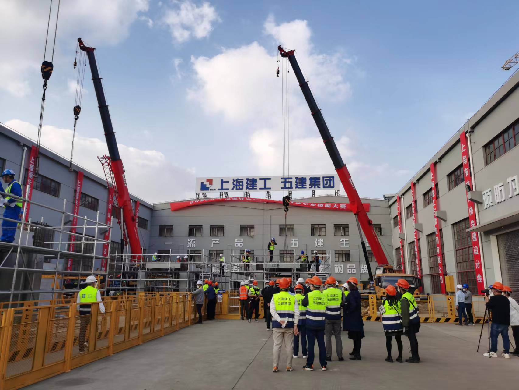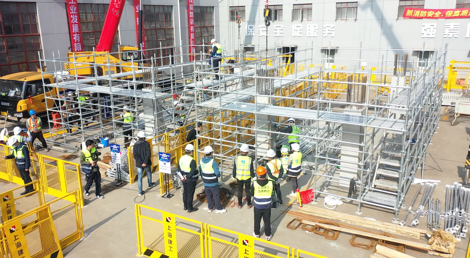 参加此项比赛的共9支队伍,每支队伍7人,其中3名辅助工,他们需要在4个小时内成功搭设一栋整体装配式框架结构的工法楼。选手们从构件吊装准备、引导就位到安装校正,有条不紊地操作着。一旁的3台好体育投注网站起重机高举大臂,与他们紧密配合。