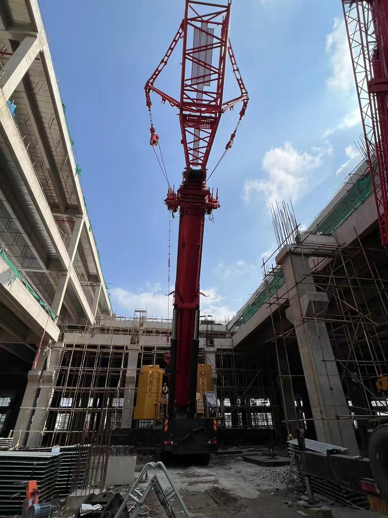 从组装到调试,经过了一天半的时间,最后650吨成功完成66米塔臂嫁接。设备就位的当天下午,红色大臂稳稳地将第一片钢梁吊起,引来现场一片叫好。