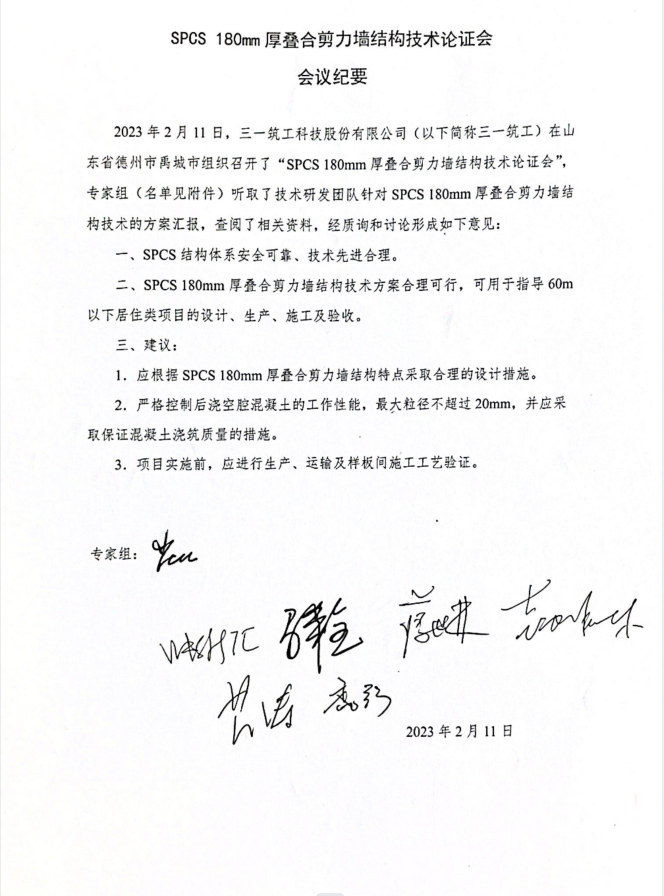 专家组听取了技术研发团队针对180mm厚空腔叠合剪力墙结构技术的方案汇报,查阅了相关资料,经质询和讨论,一致认为“SPCS结构体系安全可靠、技术先进合理;SPCS 180mm厚叠合剪力墙结构技术方案合理可行,可用于指导60m以下居住类项目的设计、生产、施工和验收。”