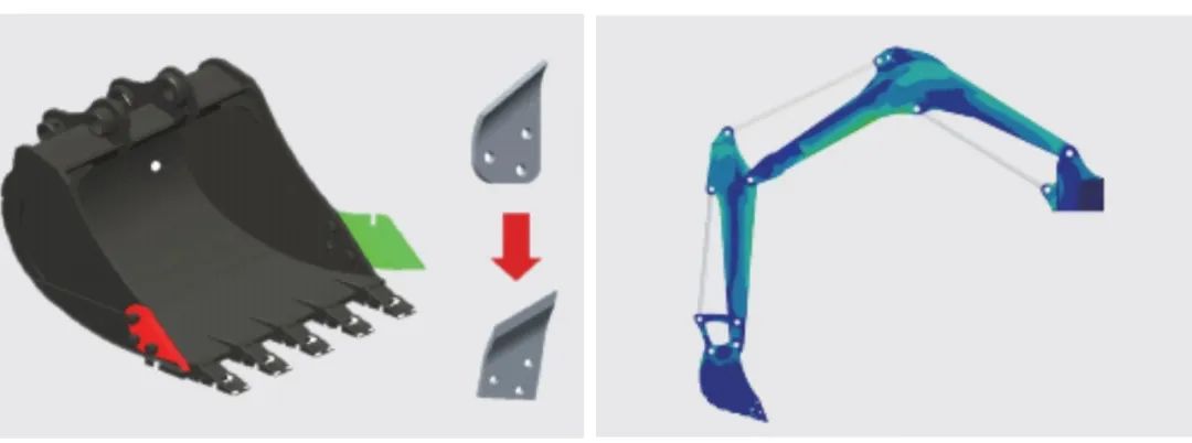 动臂加强板厚度增加⬆,强度更高⬆,采用锻件式后支承,避免局部焊接应力集中,工作装置寿命大幅提升⬆。