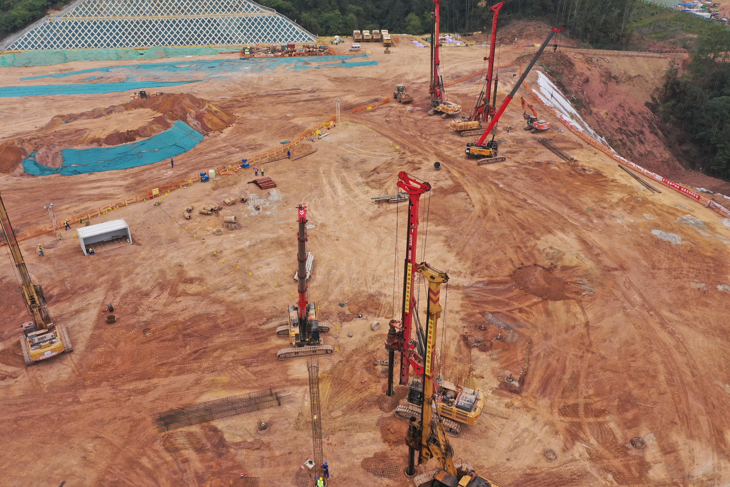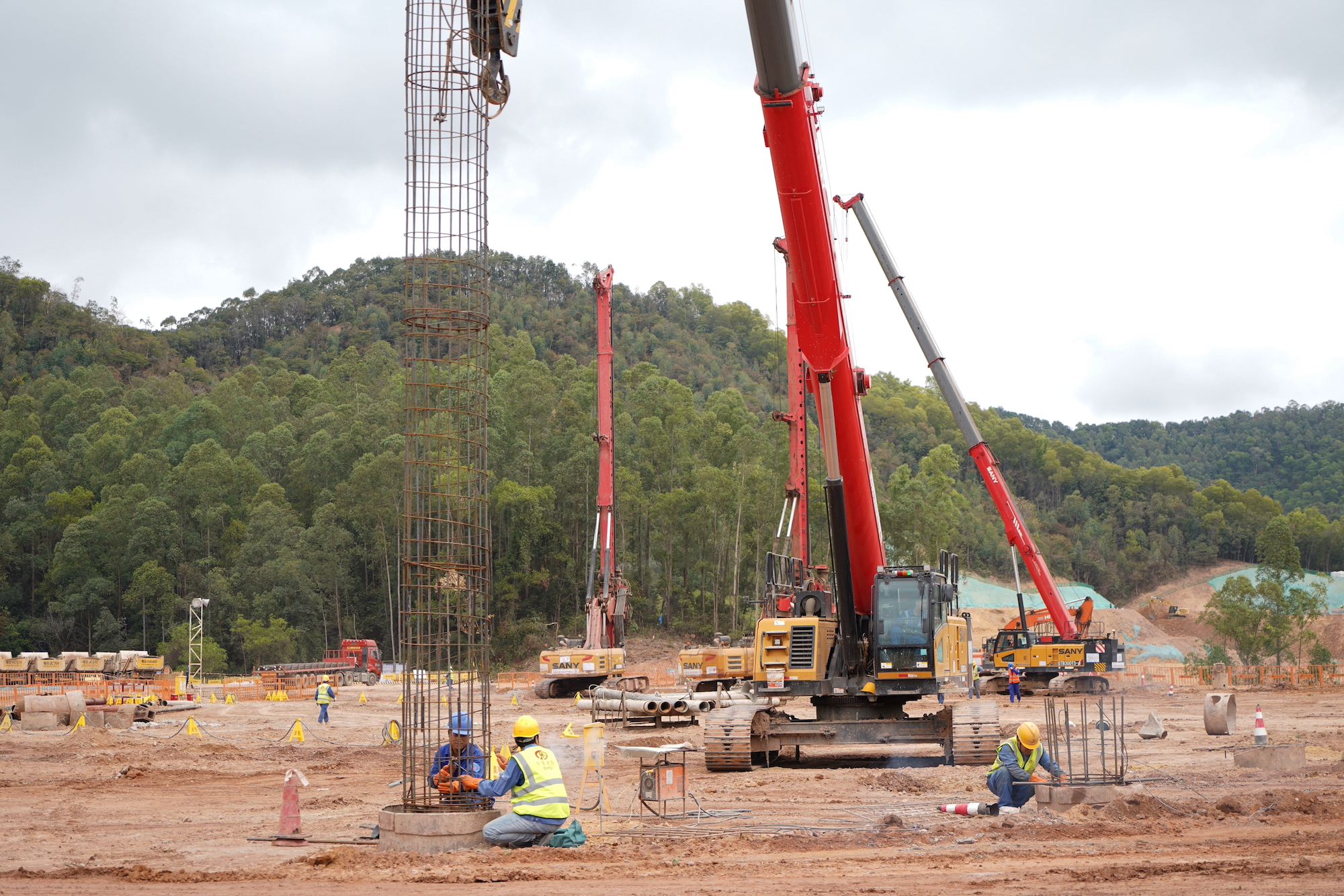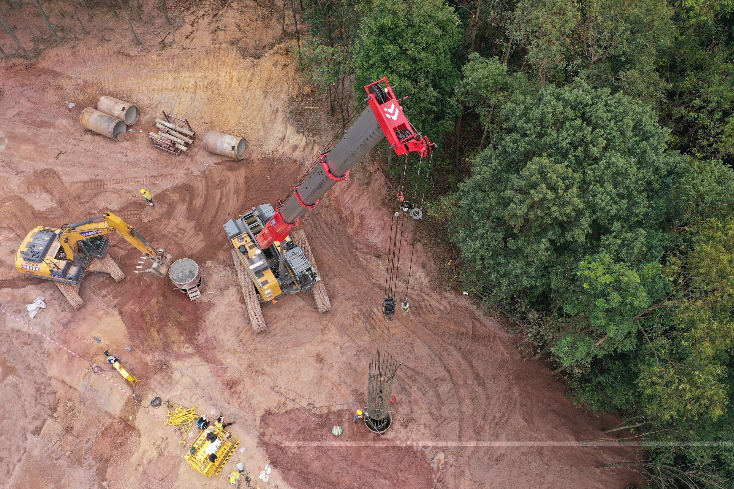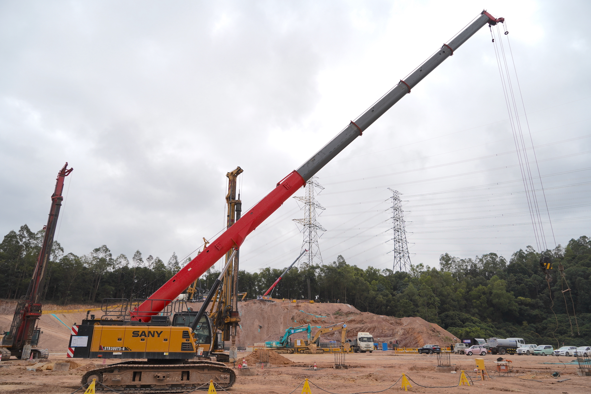 现场,有5台好体育投注网站伸缩臂履带起重机正在配合旋挖钻进行作业。其中,3台STB300T5-6在平地,钢筋笼在施工现场加工完成后,由伸缩臂履带起重机吊起,行走至指定位置上再下笼。平均一台伸缩臂配合2-3台旋挖钻机。