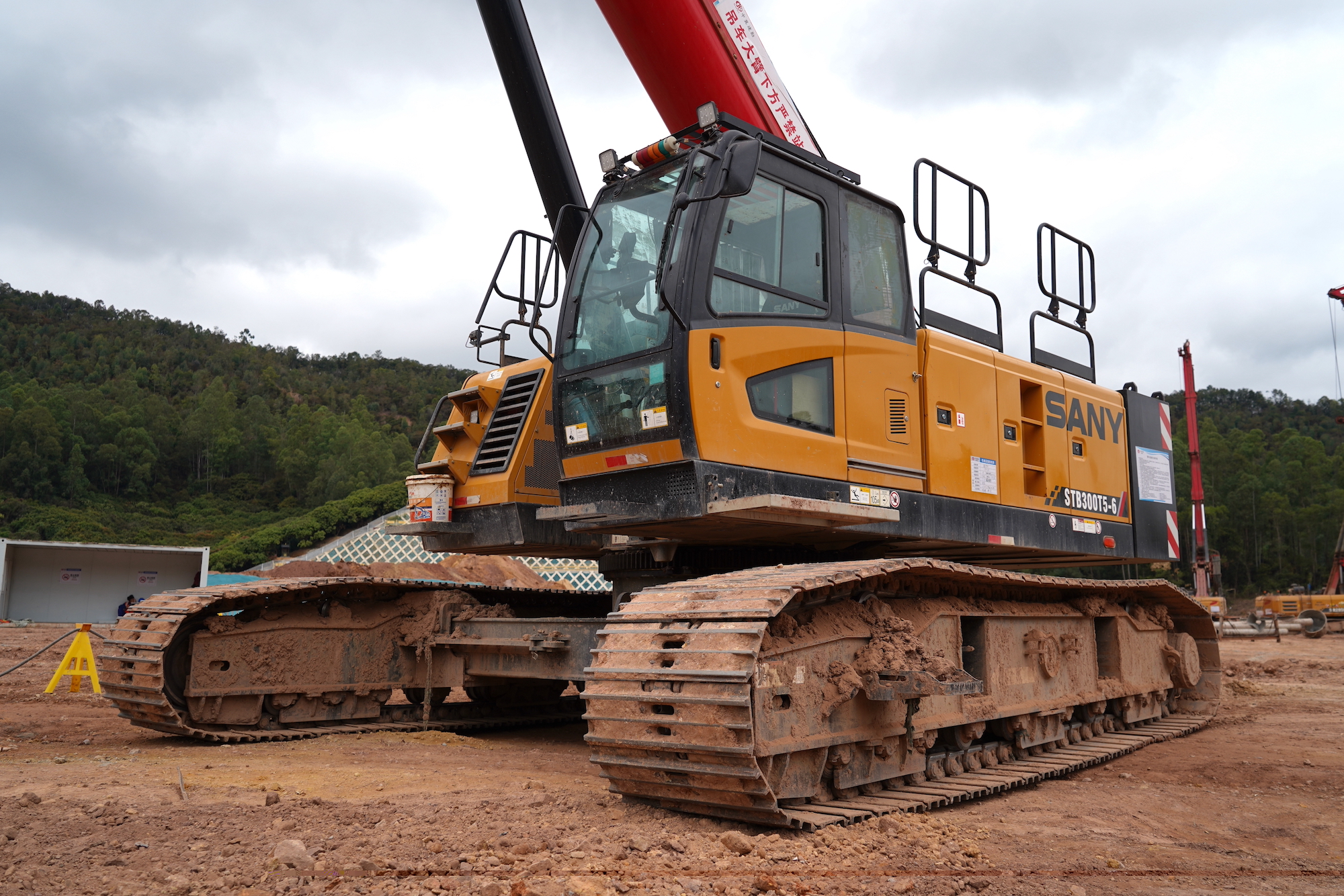 STB300T5-8操作手敬文俊说:“旋挖钻施工需要配合水流清洗设备、固化洞壁,一般现场都是泥泞不堪。如果使用传统的汽车吊,除了要修路、铺置钢板枕木,还要接二连三地移位、打支腿。”