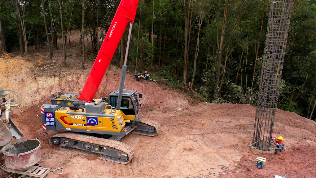 另外2台STB300T5-8,在山脚吊装钢筋笼后,带载通过30°左右的坡,行走150-200米到达指定位置后下笼。