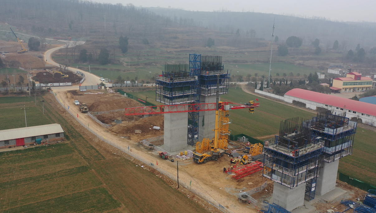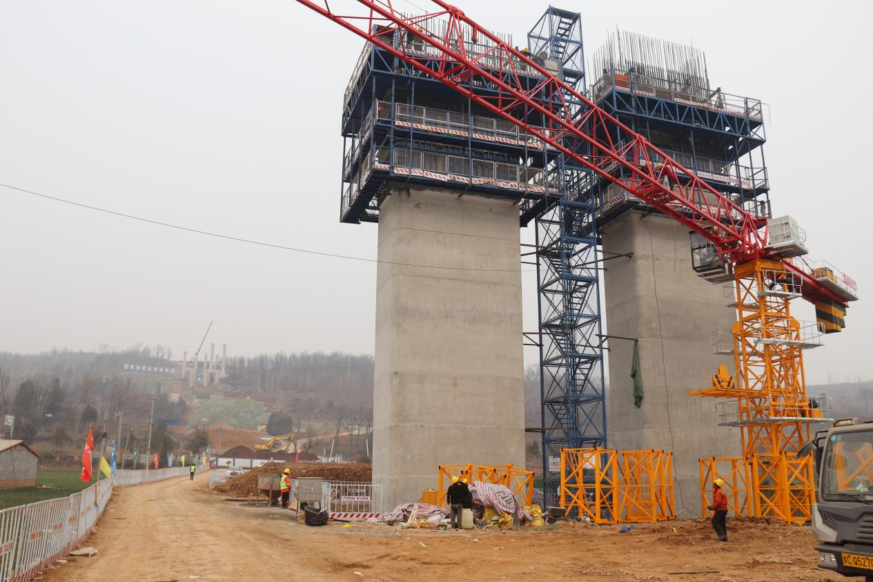河南久必久机械设备有限公司的桥梁施工经理穆建超说:“济新高速畛河特大桥位于济新高速二标二分部,这座桥桥墩数量多,大多高度在50至70米,最高的桥墩高达78米,接近30层楼的高度,一般的汽车起重机受场地所限,已经远远不能完成上料任务了,因此这次施工我们出动了塔机。”