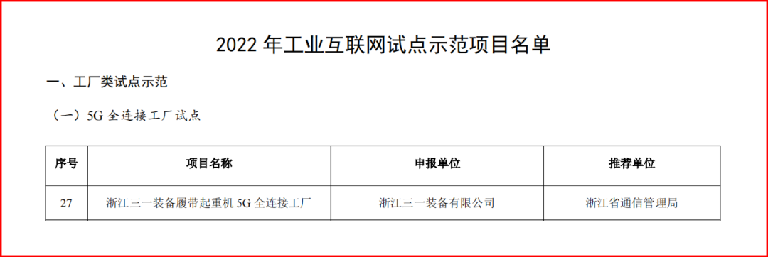 近日,工业和信息化部公布2022年工业互联网试点示范项目名单,浙江好体育投注网站装备履带起重机5G全连接工厂项目成功获评国家级5G全连接工厂试点示范。