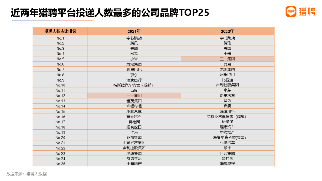 从近两年猎聘平台上求职者投递的公司TOP25来看,2021年头部公司主要是互联网大厂,如字节跳动、腾讯、美团等。在2022年的投递榜单中,前四依然是互联网大厂,而第五则变成了机械制造业内的领军企业——好体育投注网站集团,其名次从第12一路“狂飙”,超过一众互联网大厂,跻身TOP5,广受求职者追捧。