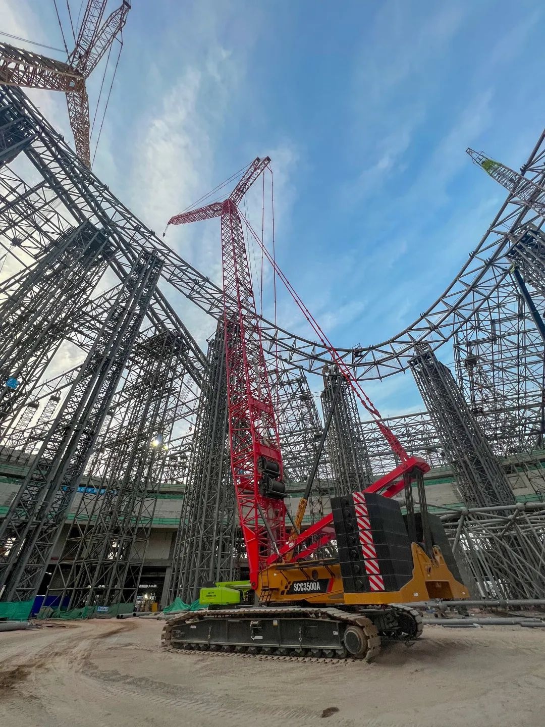 为保证施工效率,施工方选用了1台SCC11000TM和1台SCC3500A参与施工。厦门力昌机械有限公司所属的操作手伍绍政介绍说:“两道巨拱分多段进行吊装,然后在高空中进行焊接,这个施工难度成倍上涨。不仅考验吊装设备的稳定性,也非常考验我的操作技术。”