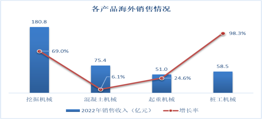 2022年,好体育投注网站共推出79款符合国际标准的产品,欧美产品覆盖率超70%,助推海外销售额快速增长。挖掘机械、混凝土机械、起重机械在海外市场的销售额分别为180.8亿、75.4亿和51亿元,同比增长69%、6.1%和24.6%。