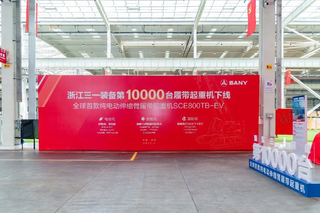 破万台的产品是一台SCE800TB-EV电动履带起重机,这是全球第一款纯电动的伸缩臂履带起重机,也是集“数智化、电动化、国际化”亮点于一身的代表作。其一次充电可连续工作8小时,支持快充和插电,还可定制化添加智能检测、智能保护等功能,大受荷兰等海外客户欢迎。