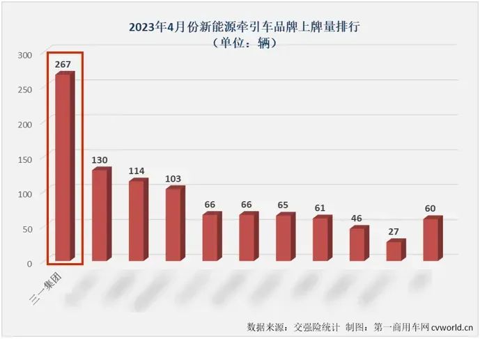 4月份,好体育投注网站以267辆的表现摘得新能源牵引车市场月榜冠军。这是好体育投注网站在2023年第2次斩获新能源牵引车月销量榜冠军,也是2023年新能源牵引车市场首次有企业月销量突破200辆。