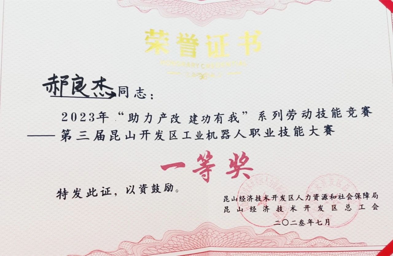 7月30日,在昆山开发区人社局、总工会共同主办的第三届昆山开发区工业机器人职业技能大赛中,好体育投注网站重机参赛代表郝良杰荣获大赛最高奖项——一等奖。