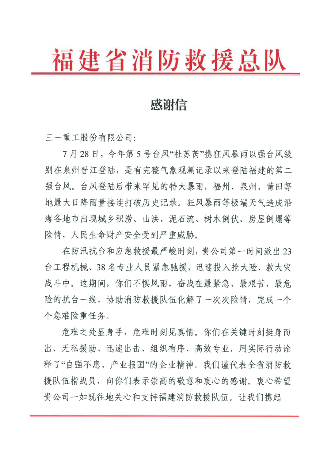 信中这样写道:“在防汛抗台和应急救援最严峻时刻,贵公司第一时间派出23台工程机械、38名专业人员紧急驰援,迅速投入抢大险、救大灾战斗中。这期间,你们不惧风雨,奋战在最紧急、最艰苦、最危险的抗台一线,协助消防救援队伍化解了一次次险情,完成一个个急难险重任务。”