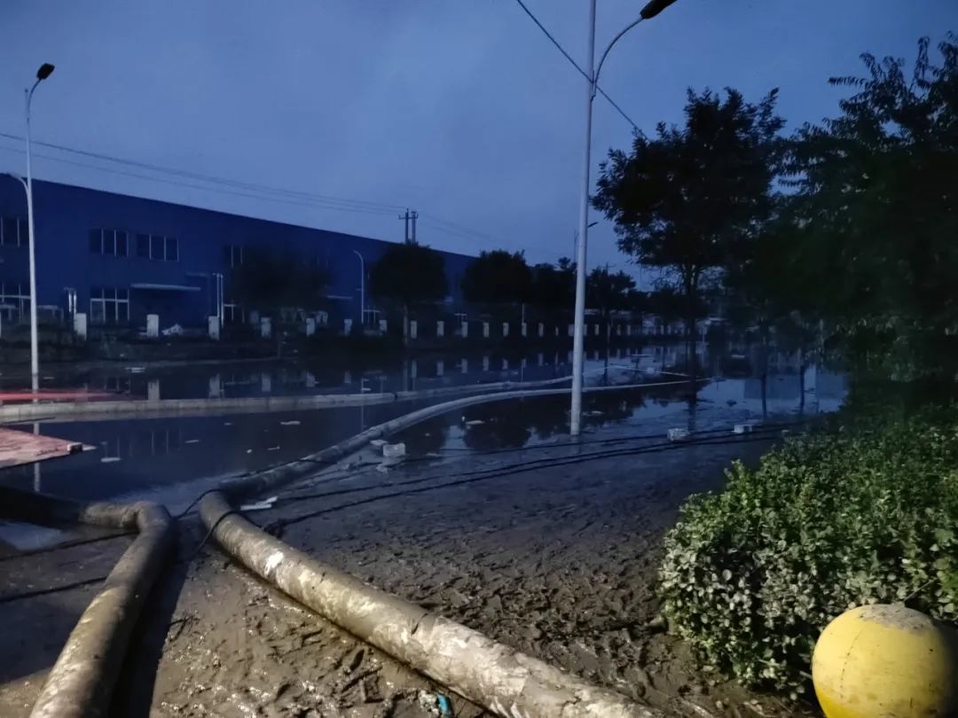 没有片刻停顿,全体队员立即投入到排涝作业当中,在过膝深的污水中,查看水势、勘查地形、制定排水路线、安装调试排涝车、铺设100多米的排污管道……