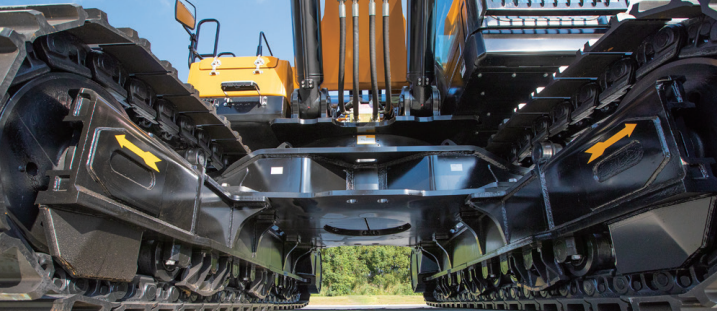 采用进口 KYB 行走马达,提供强劲驱动力矩;加强型两筋耐磨履带,重型支重轮,全防护型履带护板和一体式组焊下车,保证恶劣环境下行走装置强度。