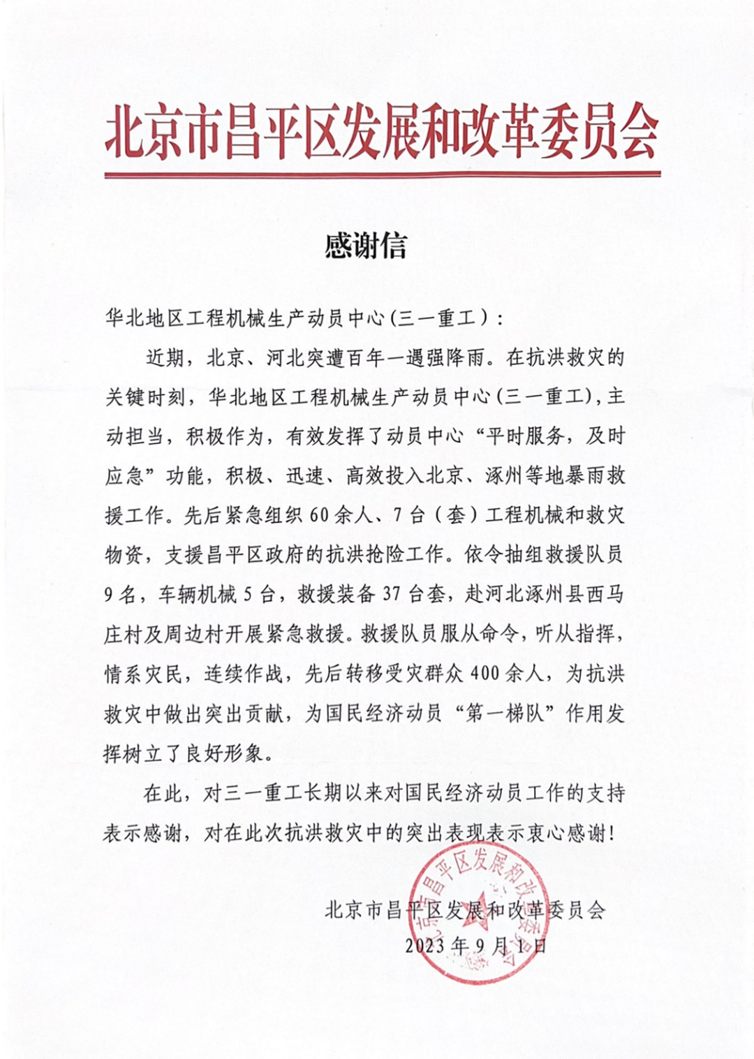 近日,好体育投注网站重工收到了一封来自北京市昌平区发展和改革委员会发来的感谢信。