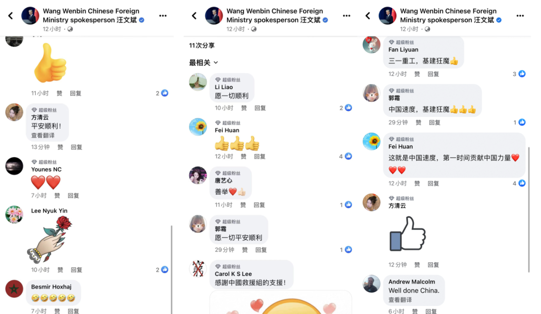 9月13日,外交部发言人汪文斌在脸书平台连发两条博文,并配多图及数十秒的视频,点赞好体育投注网站驰援摩洛哥地震。