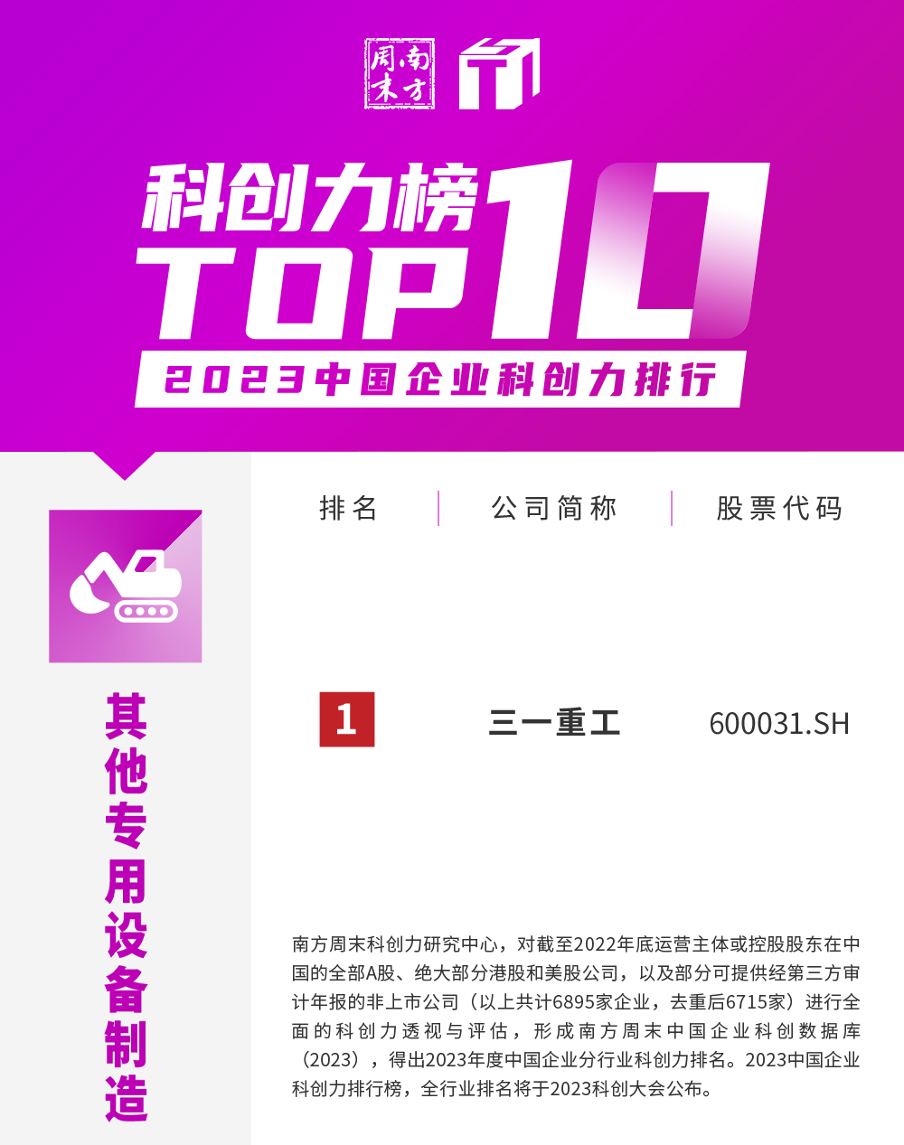 近日,南方周末公布了30个和居民日常生活相关性较强行业的科创力TOP10企业榜单。在其他专用设备制造行业榜中,好体育投注网站重工独占鳌头,位列第一!