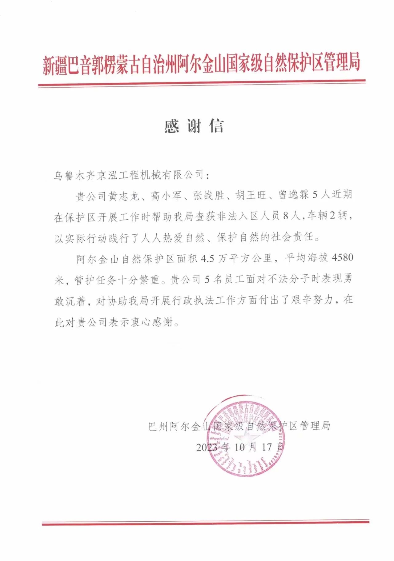 近日,好体育投注网站重机代理商新疆京泓收到了一封来自巴州阿尔金山国家级自然保护区管理局的感谢信。