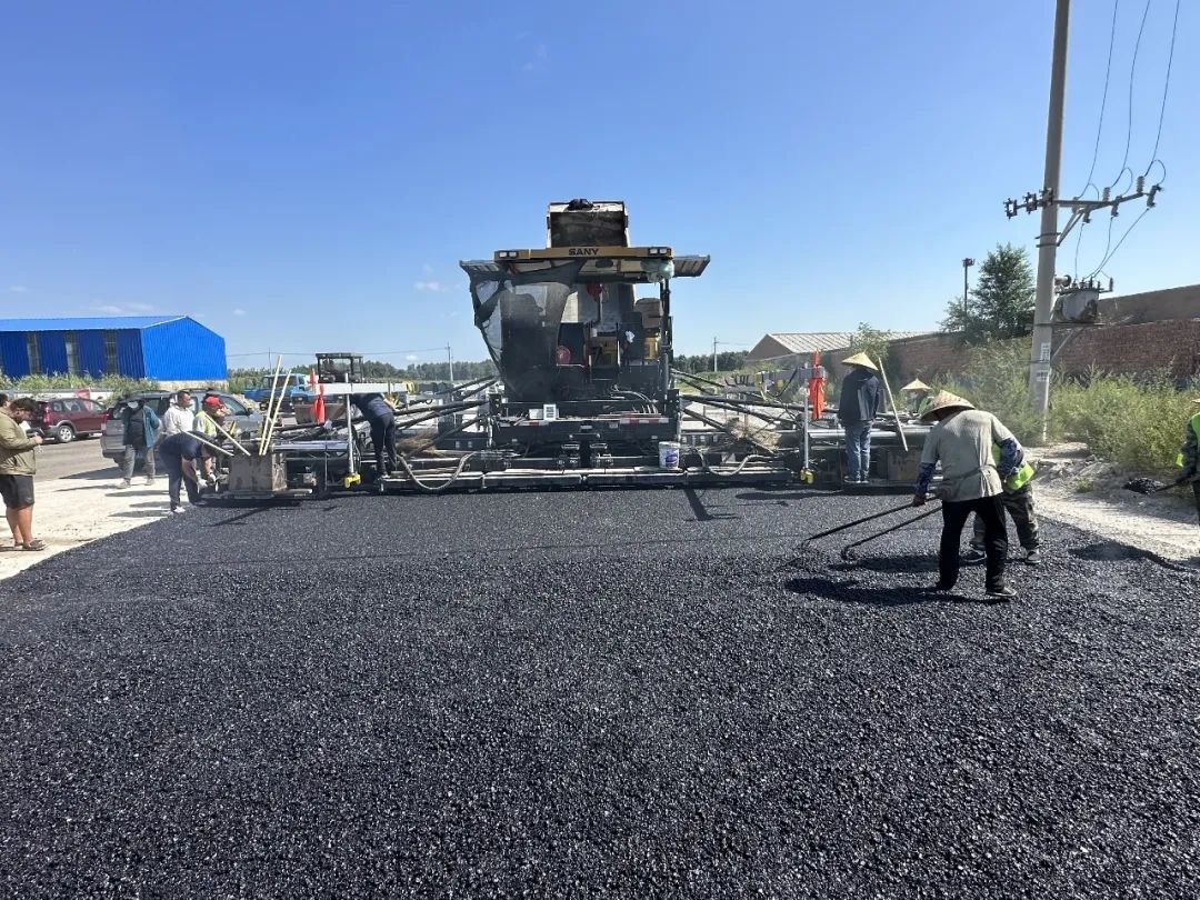 施工现场,工作人员和工程车辆都在紧张有序的工作中,路基和路面基本成型,工程车、压路机、推土机等大型机械设备来回穿梭,场面如火如荼,热闹非凡。