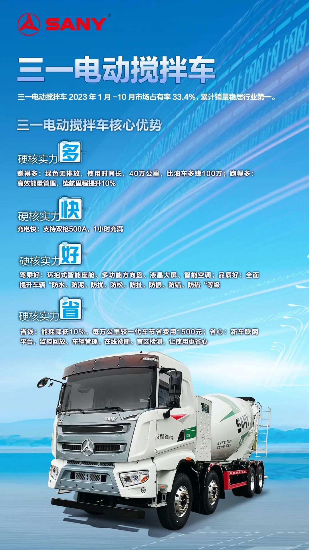 好体育投注网站电动搅拌车2023年1月-10月市场占有率33.4%,累计销量稳居行业第一。作为“能耗最低的电动搅拌车”,好体育投注网站电动搅拌车以高效节能、品质过硬、驾乘舒适、无忧服务获得用户青睐。支持双枪500A,充电仅需1小时;高效能量管理,续航里程提升10%;上装全电动直驱系统,能耗降低10%;自制专用底盘,一体化设计;新一代新能源专属智能座舱,颜值爆表空间大,视野开阔盲区小,智能空调,高端气浮座椅,舒适媲美乘用车。