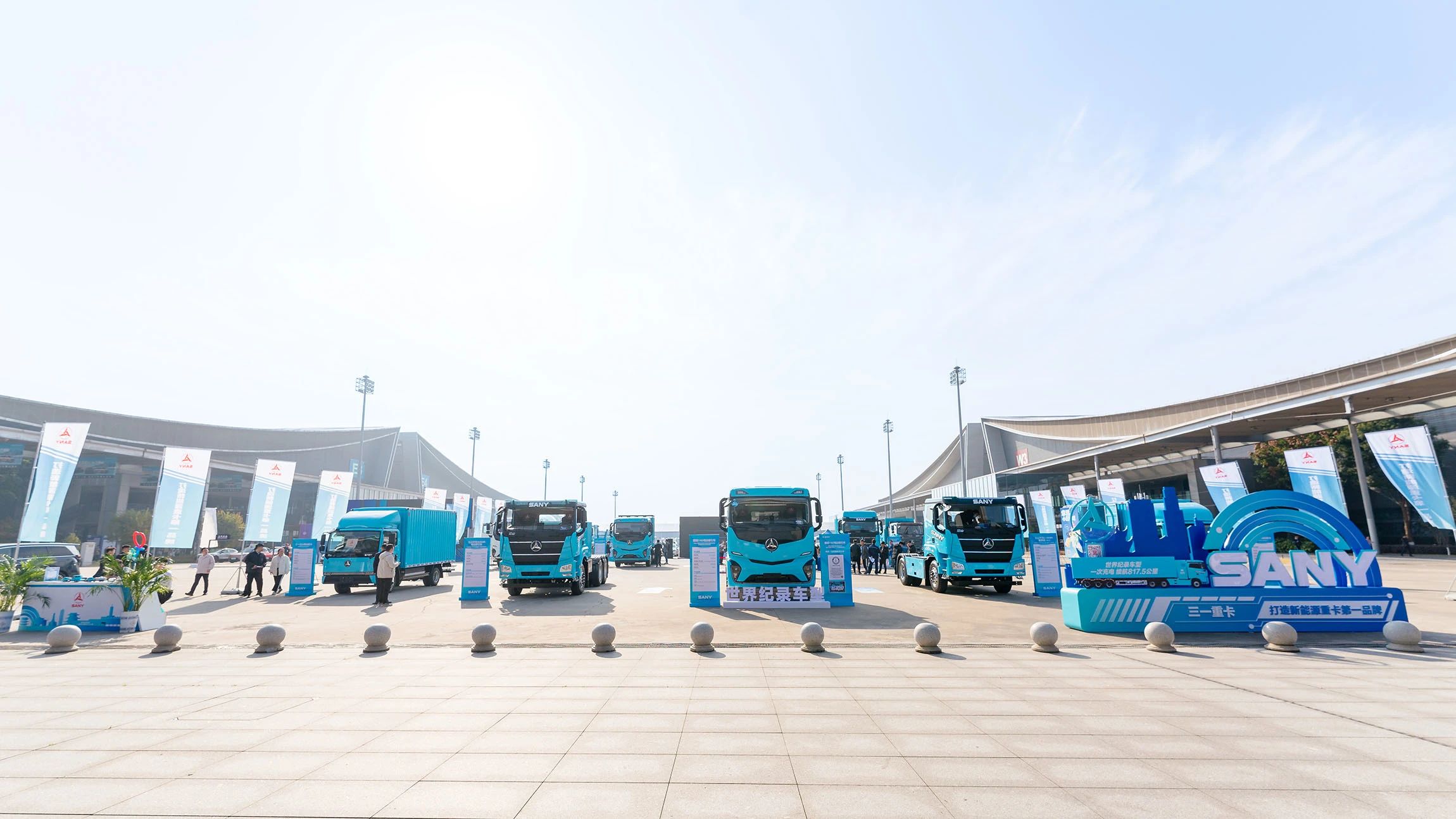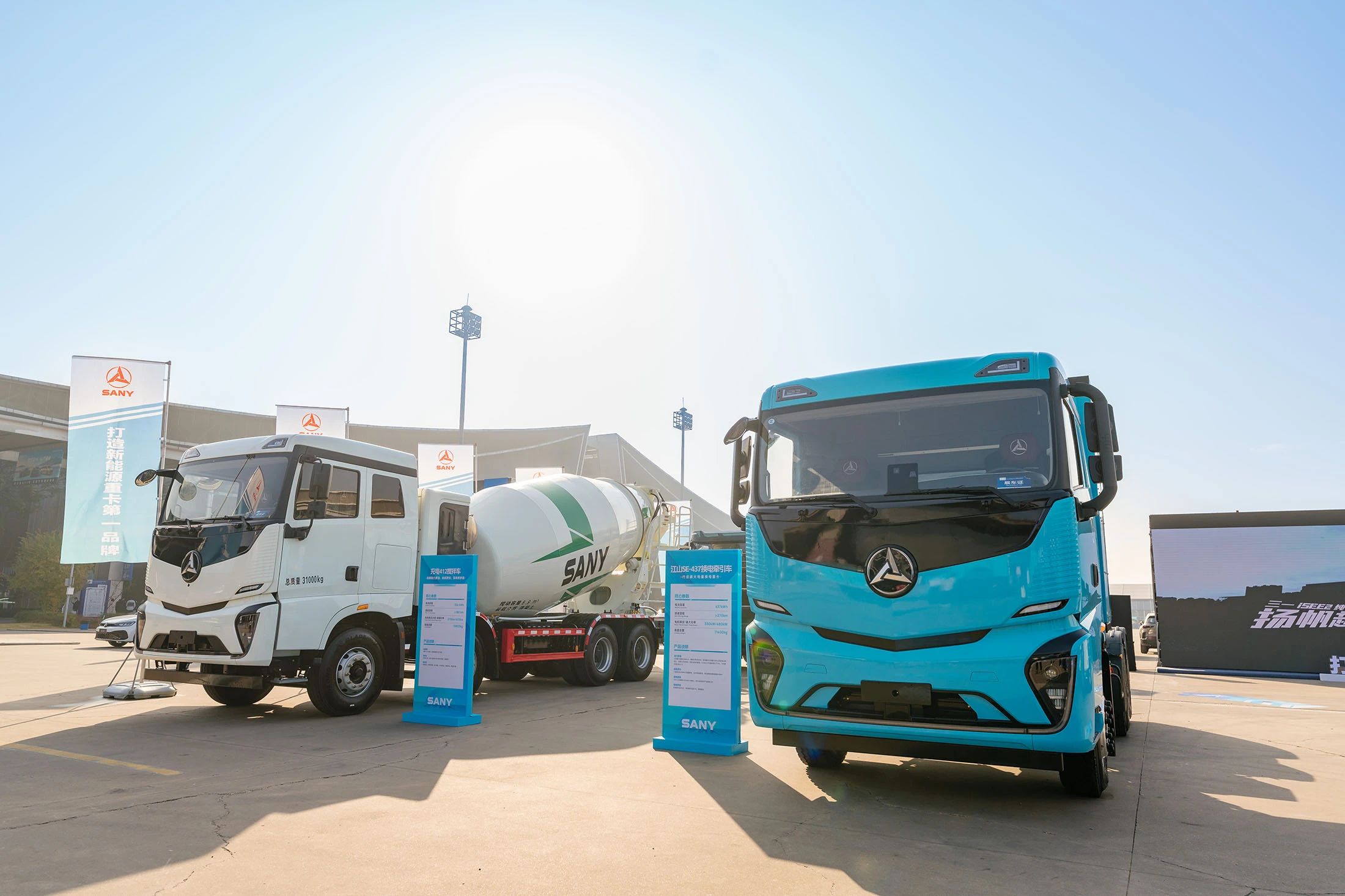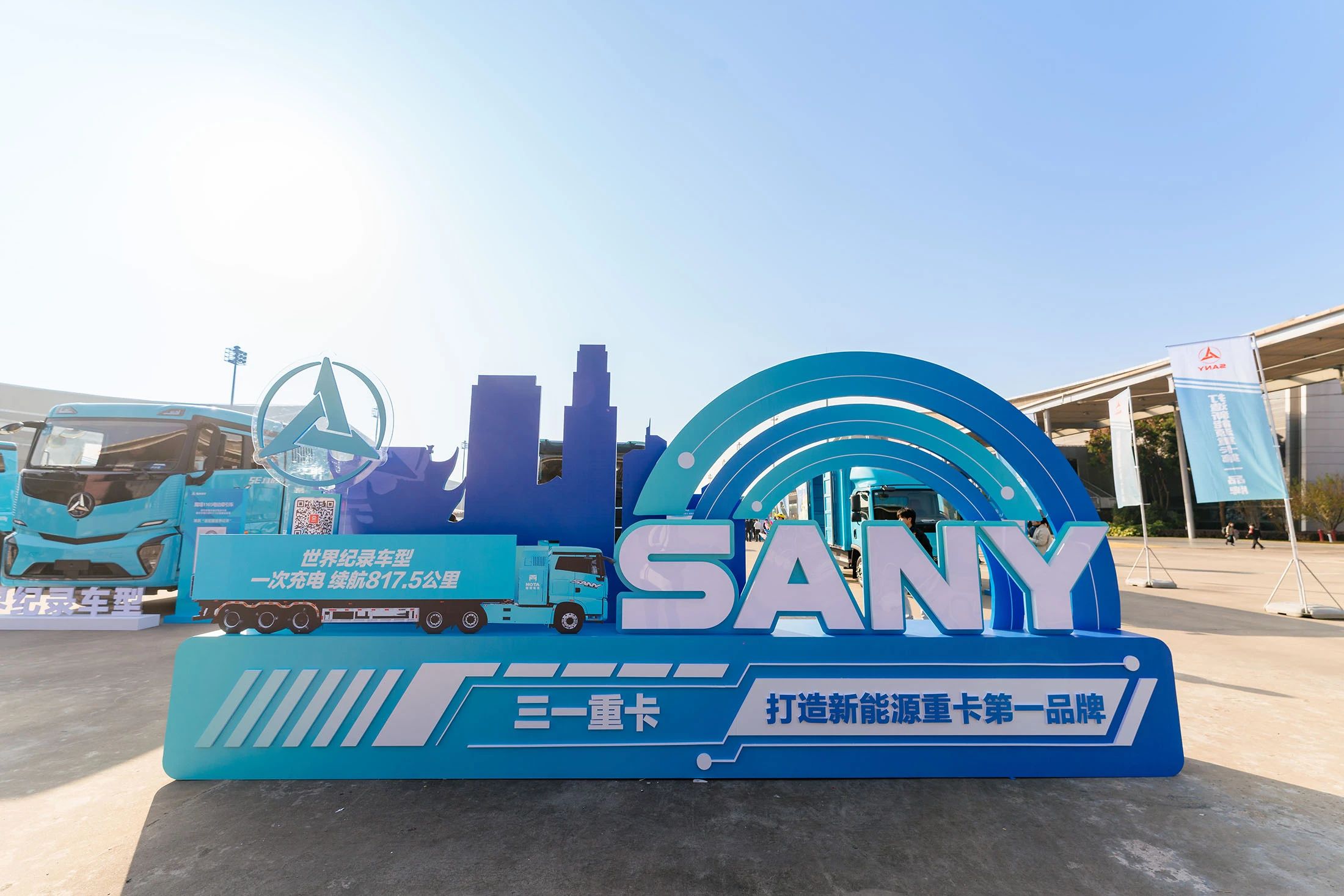 好体育投注网站专属2000㎡户外展区,共展出10台好体育投注网站新能源代表车型,涵盖电动牵引车、自卸车、搅拌车、轻卡以及氢燃料牵引车。