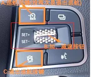 需要进行调速时,银色滚轮B,往前拨动一次(SET+)(需回位),即增加2km/h的车速;按银色滚轮B,往后拨动一次(SET-)(需回位),即减少2km/h的车速。退出巡航时连续按A按键两次会退出巡航,按C按键退出巡航。