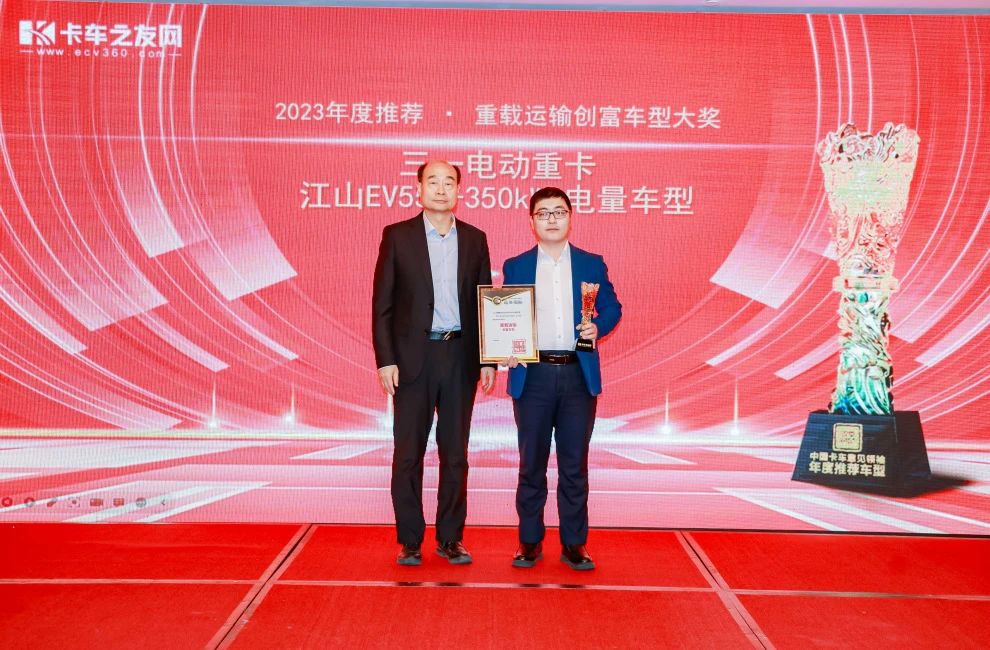 好体育投注网站电动重卡江山EV550-350kWh电量车型荣获本届运营调查意见领袖推荐的“重载运输创富车型大奖”。