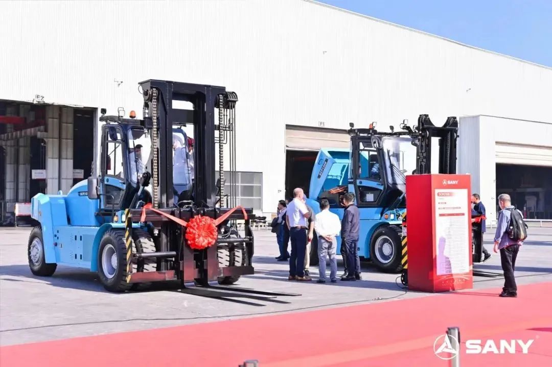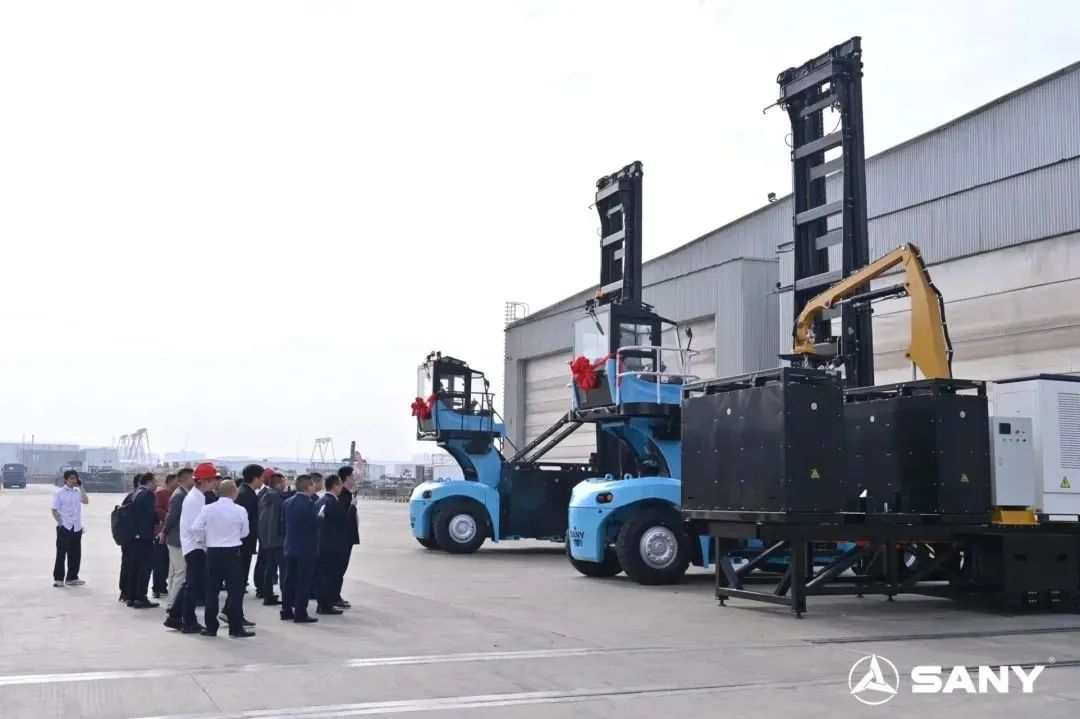 活动现场,纯电正面吊3款、增程正面吊、换电正面吊、纯电堆高机2款、换电堆高机、电动集卡2款、电动重叉2款、无人平板车、换电小车、小型自动充换电站等15款产品组成的港口设备新能源军团霸气十足,它们一字排开,悉数亮相,接受来自全球主流港口、优秀物流企业的检阅。