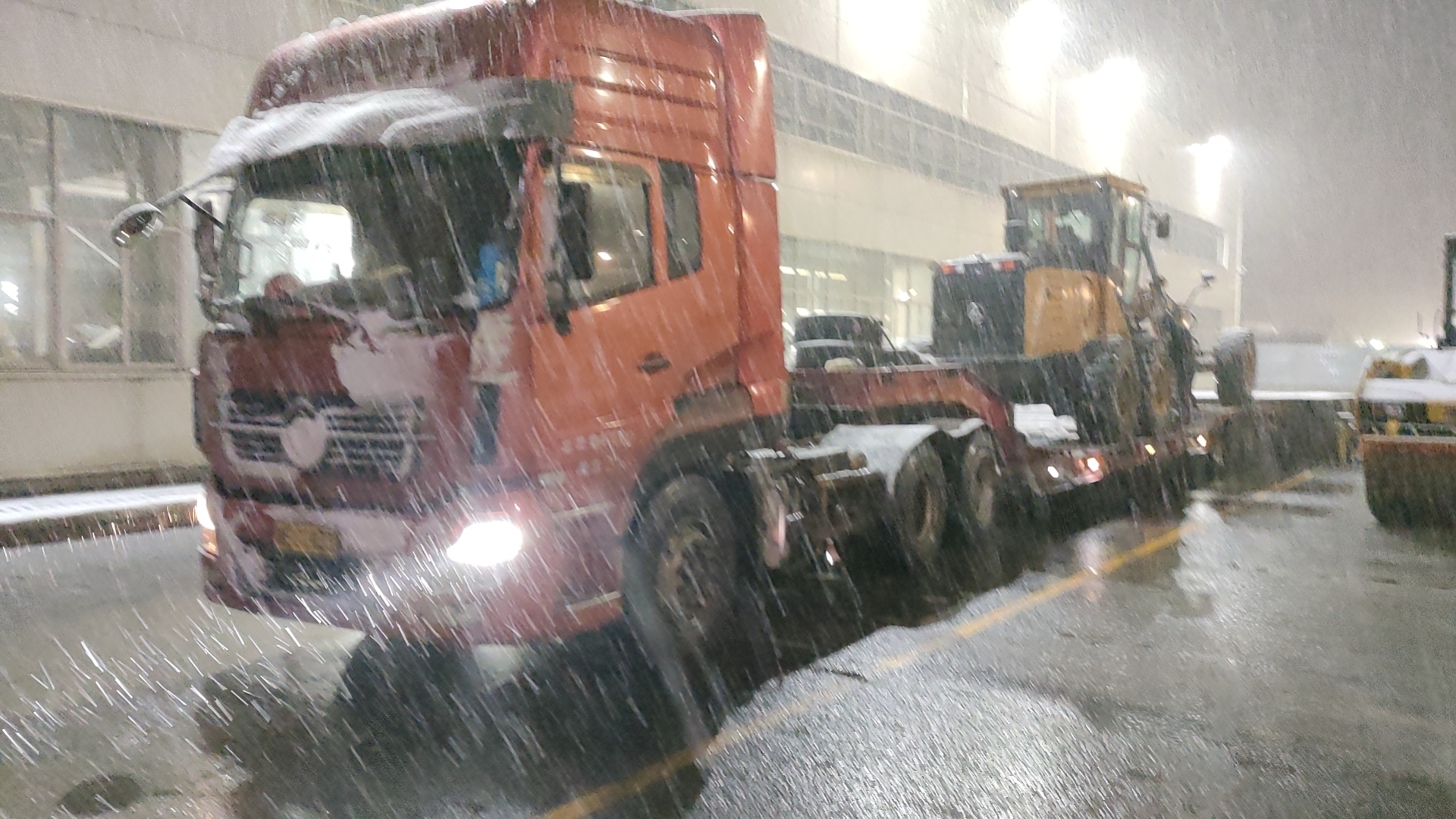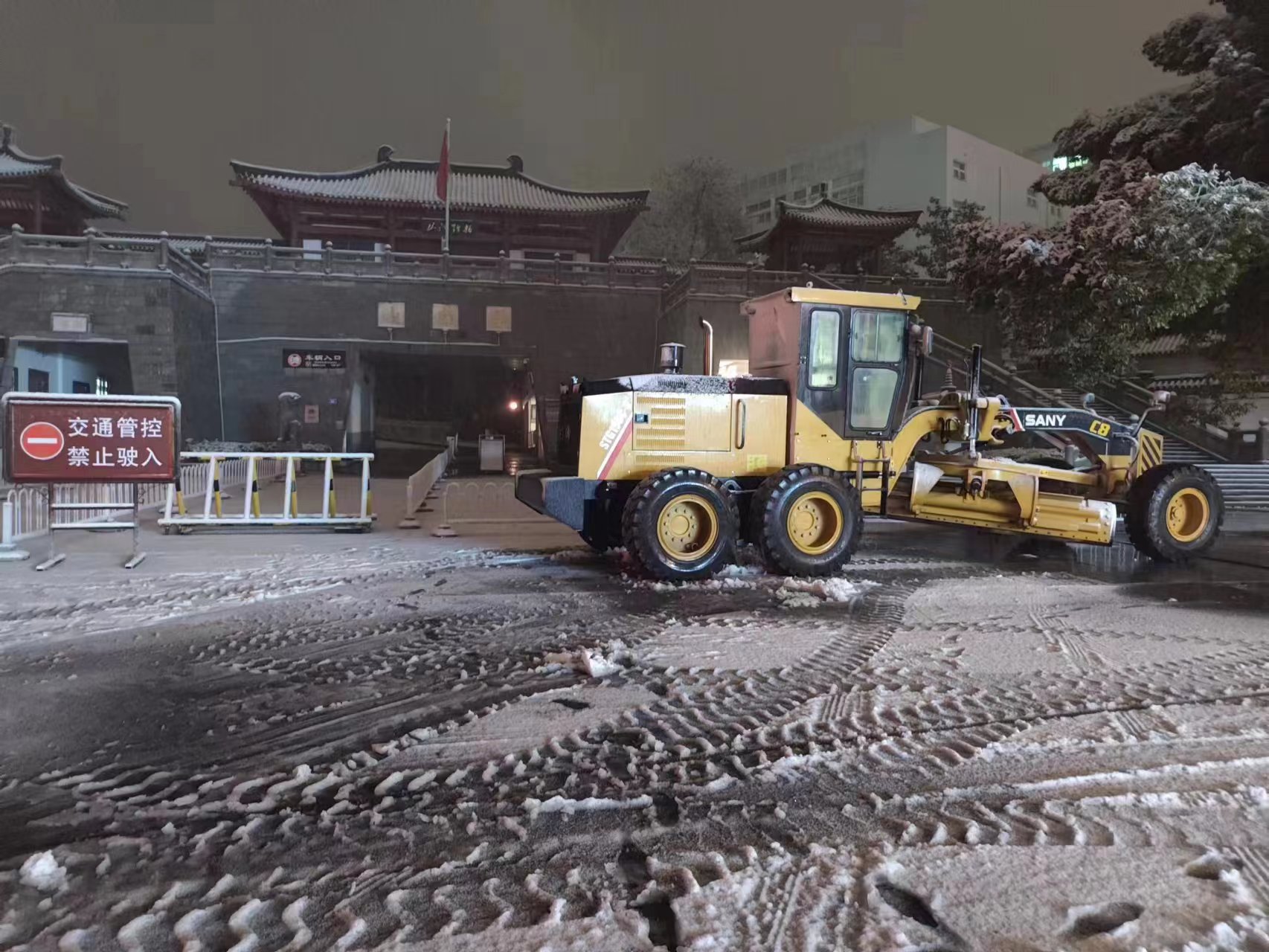 全天坚守,不断除雪,熟悉的路机黄成为了冰天雪地里的一抹“亮色”,设备前行积雪一铲而光,铲刀挥舞为出行保驾护航。