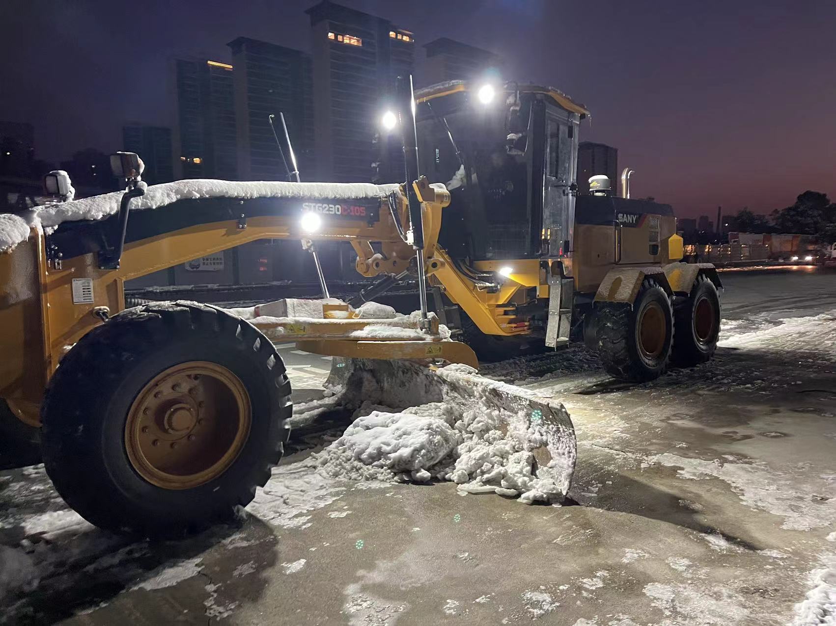在“冻起来”的这个夜晚,数台好体育投注网站平地机也整整齐齐地从好体育投注网站涟源工厂“动起来”,紧急集合分别奔赴星沙大道、岳麓山等长沙市以及长沙县周边主要道路,冲在破冰除雪第一线。