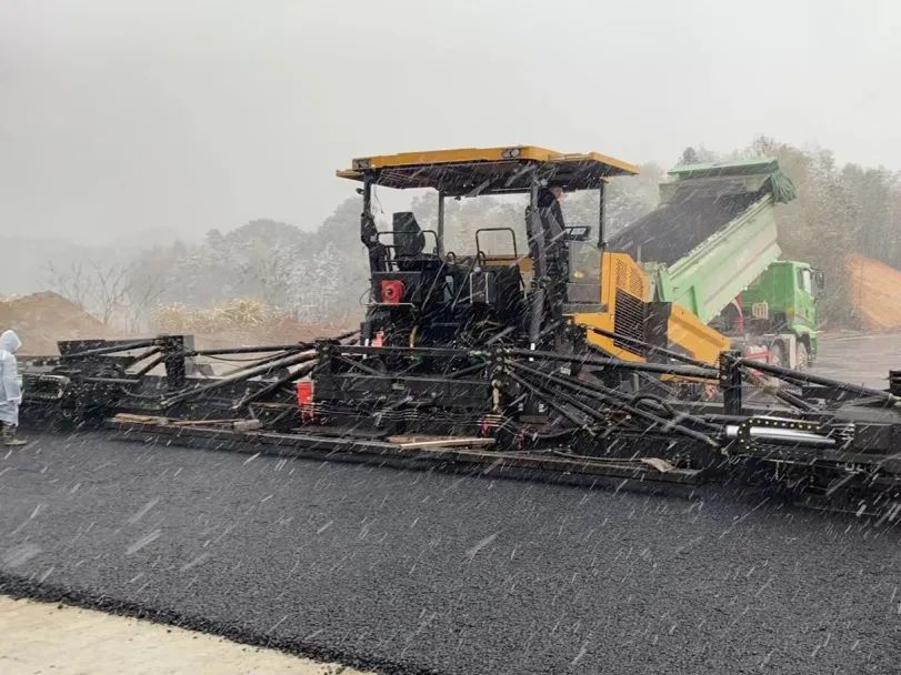 冰雪来临,挡不住筑路人的施工热情;大雪纷飞,看大宽度摊铺机抢抓工期。