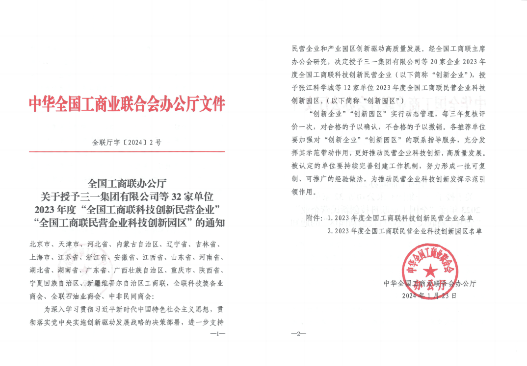 1月23日,全国工商联办公厅下发《关于授予好体育投注网站集团有限公司等32家单位2023年度“全国工商联科技创新民营企业”“全国工商联民营企业科技创新园区”的通知》,正式授予好体育投注网站集团“2023年度全国工商联科技创新民营企业”荣誉称号。