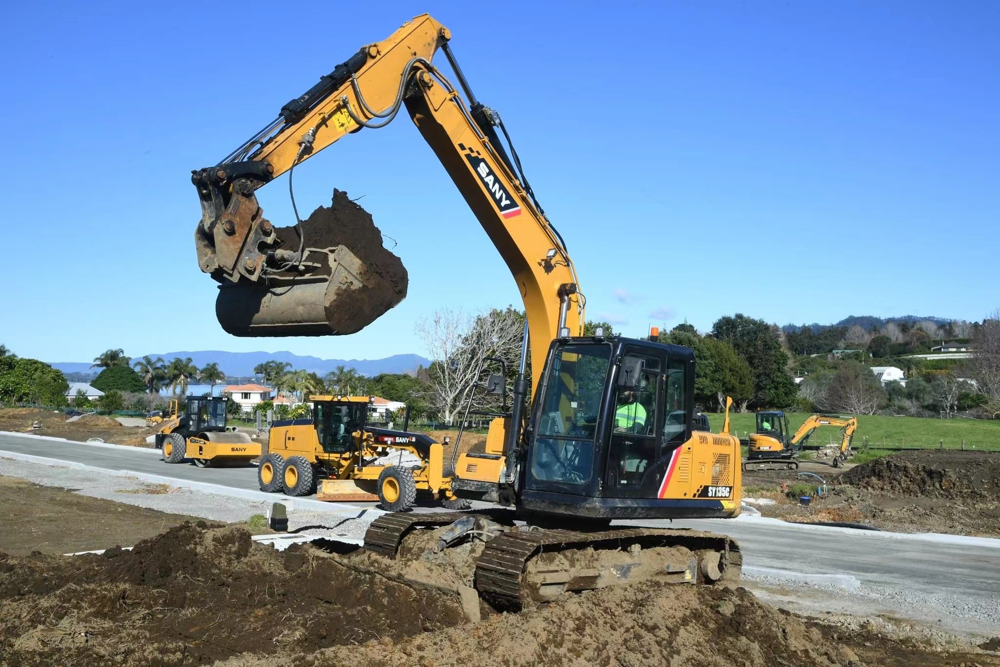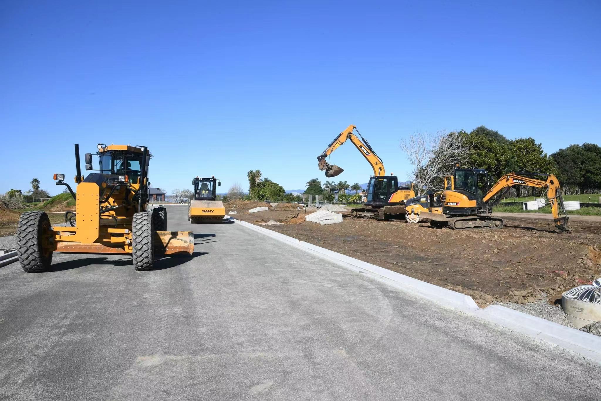 在新西兰丰盛湾道路土方路面60-70号标段的施工现场,大大的“SANY”logo在阳光下闪烁折射出耀眼光芒,数台压路机、平地机、挖机正在热火朝天地施工。