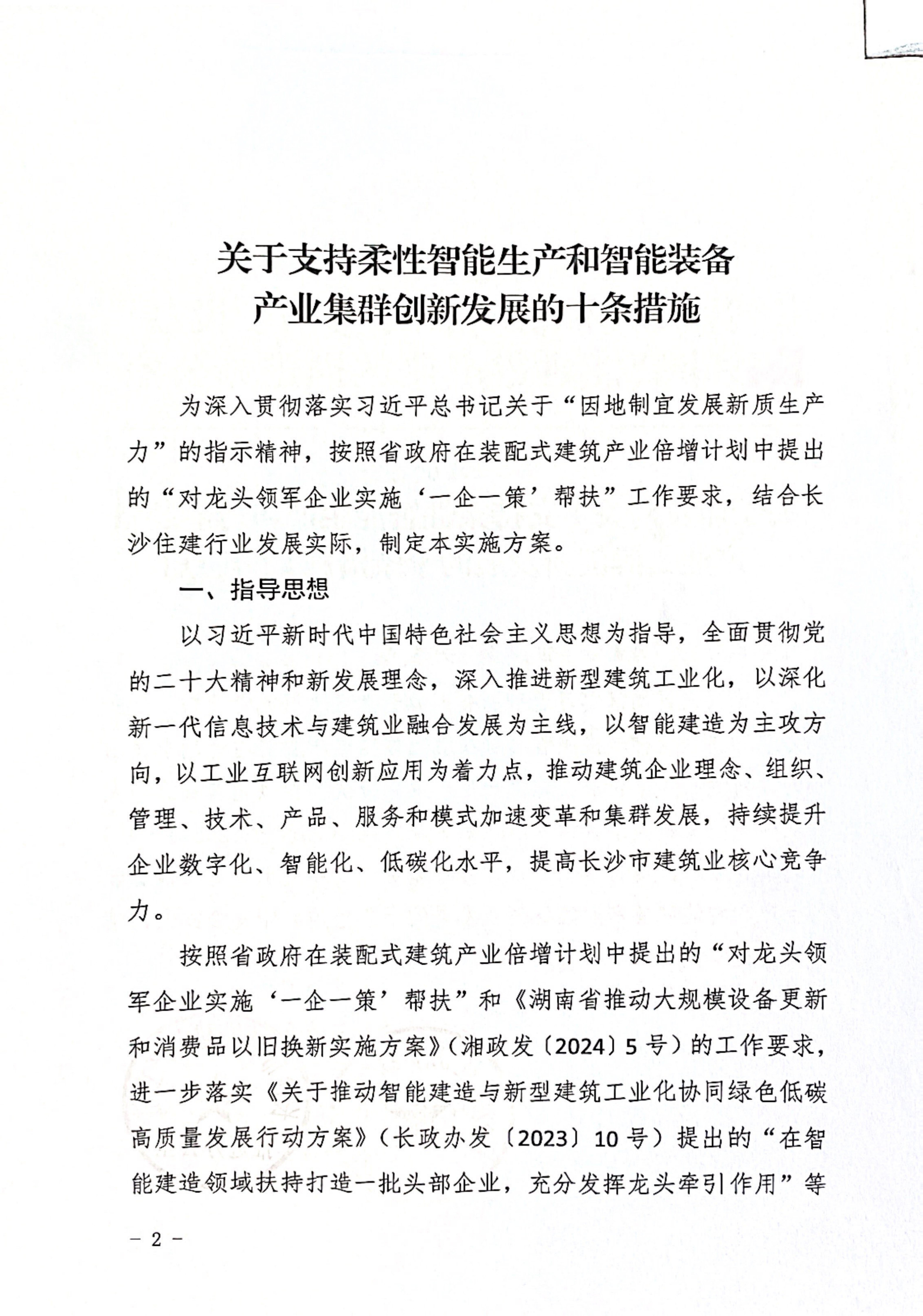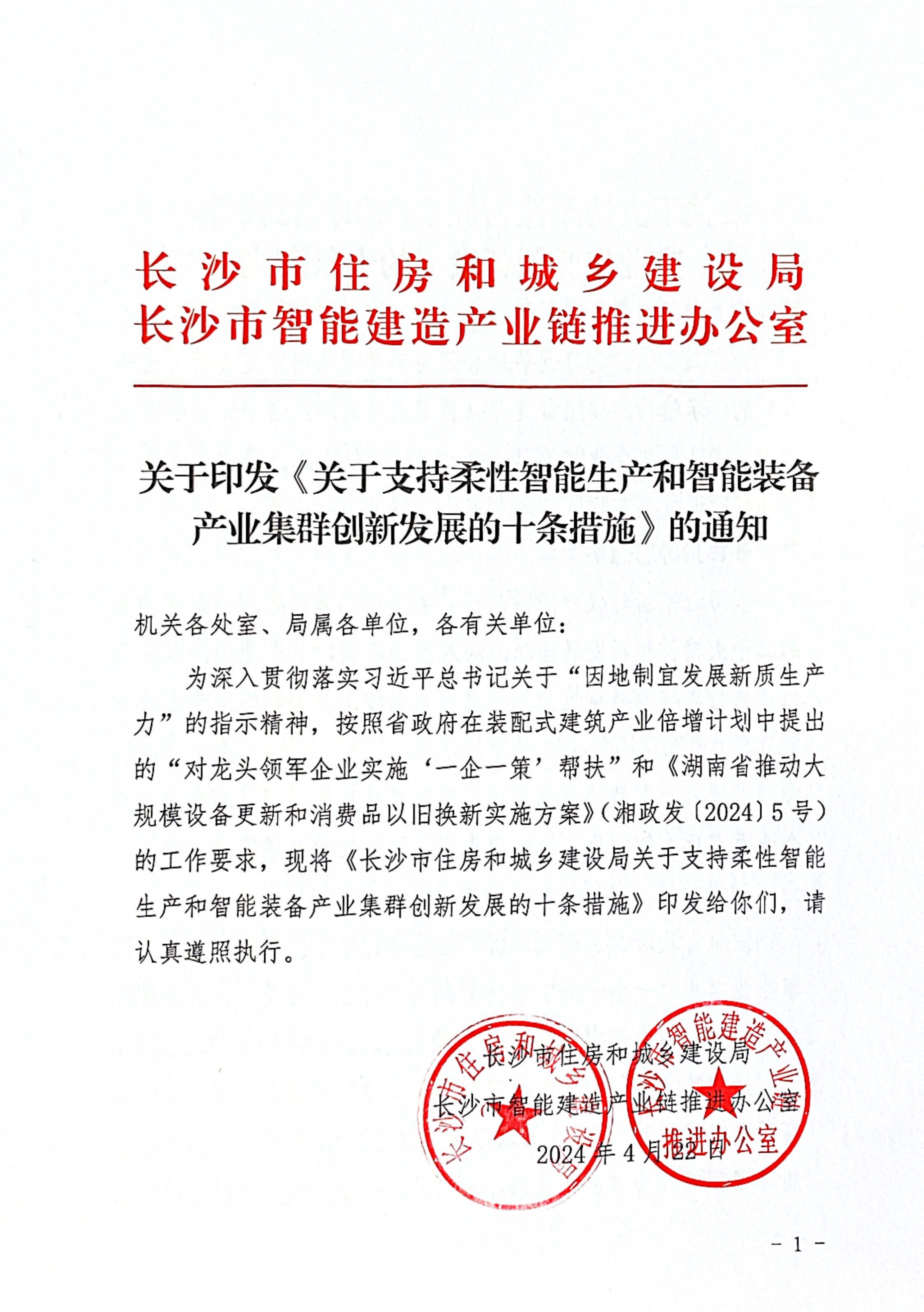 4月22日,长沙市住建局印发了《长沙市住房和城乡建设局关于支持柔性智能生产和智能装备产业集群创新发展的十条措施》。这是政府为深入贯彻落实习近平总书记关于“因地制宜发展新质生产力”的指示精神,按照省政府在装配式建筑产业倍增计划中提出的“对龙头领军企业实施'一企一策’帮扶”和《湖南省推动大规模设备更新和消费品以旧换新实施方案》(湘政发(2024)5号)的工作要求出台的措施。