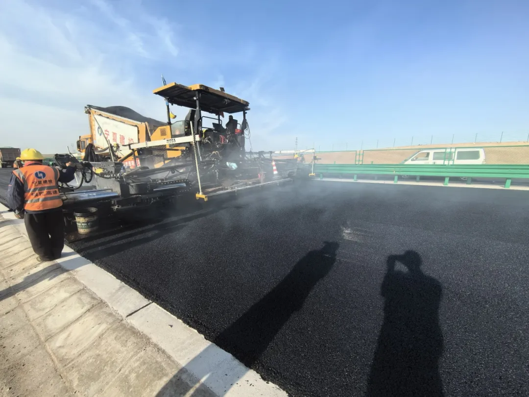 在银昆高速太阳山开发区至彭阳段2标段上面层沥青摊铺施工现场,一台20米的大宽度摊铺机正在热火朝天地施工。沥青熟料从自卸车上缓缓卸下落到摊铺机的料斗中,伴随着摊铺机“轰隆隆”地前行,沥青被均匀平整的摊铺在路面上,当滚烫的沥青与地面一接触,便升起一阵白烟,热浪伴随着沥青味儿席卷而来。