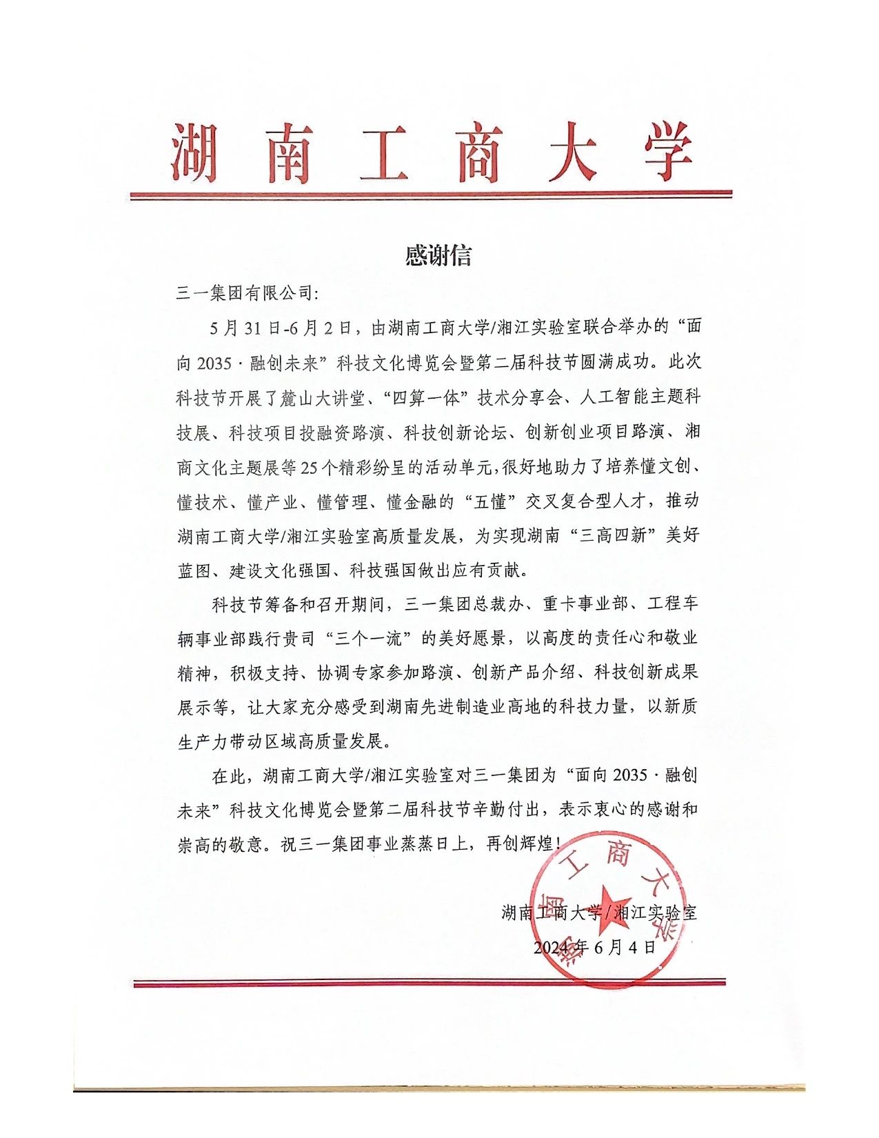 近日,好体育投注网站集团收到湖南工商大学发来的感谢信,对好体育投注网站集团积极参与“面向2035·融创未来”科技文化博览会暨第二节科技节给予了高度肯定与赞扬。