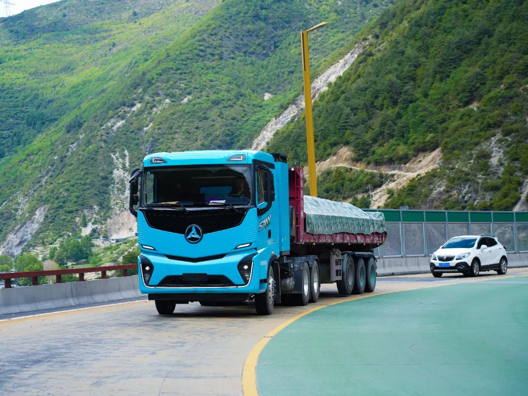 江山SE-437,凭借电驱系统、智能控制系统等创新技术,以650Ps超强动力、30%超强爬坡及36%高效能量回收能力,无惧蜿蜒山路、4298米超高海拔等恶劣工况,在车货总重49t的前提下,以30km/h平均时速完成3小时持续爬坡,海拔差高达3028米,电耗低至2.1kWh/km,是该路段首个顺利通行的电动重卡!