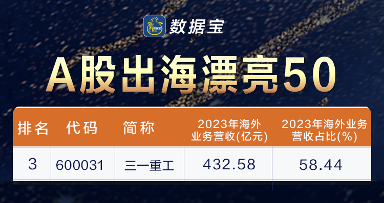 该统计以2021年至2023年海外营收占比连续3年提升,同时2023年净利润为盈利状态且同比增长的公司为基础,按照2023年海外营收依次排序,筛选出A股市场出海势头正猛的50只龙头公司,合称“出海漂亮50”。