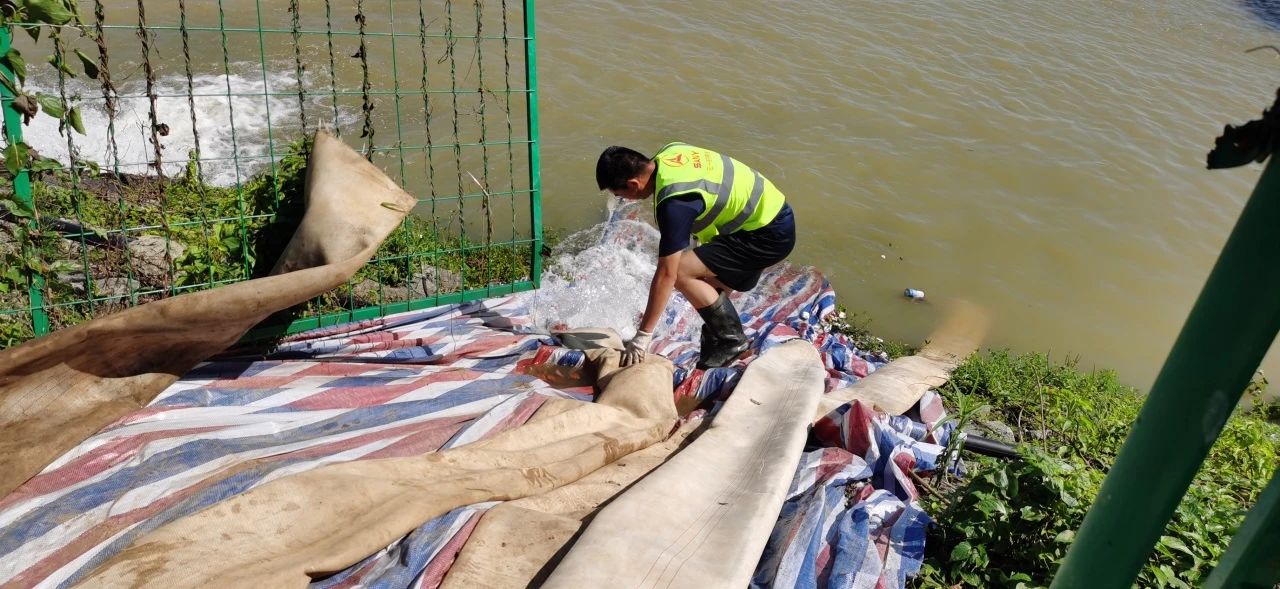 到达指定点位后,救援队成员马上查看水势、勘测地形、制定路线、铺设管道、启动排涝车进行排涝作业。
