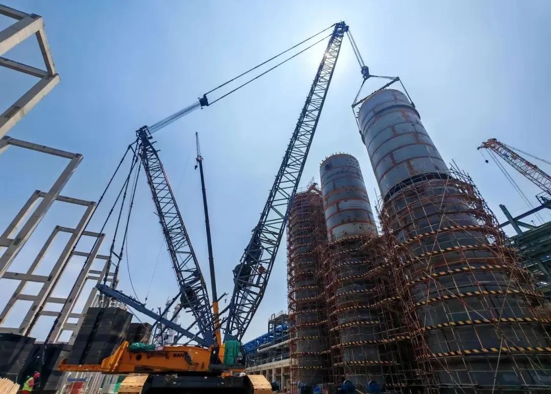 在吉林石化,完成35万吨/年苯酚丙酮装置3台氧化反应器设备吊装。
