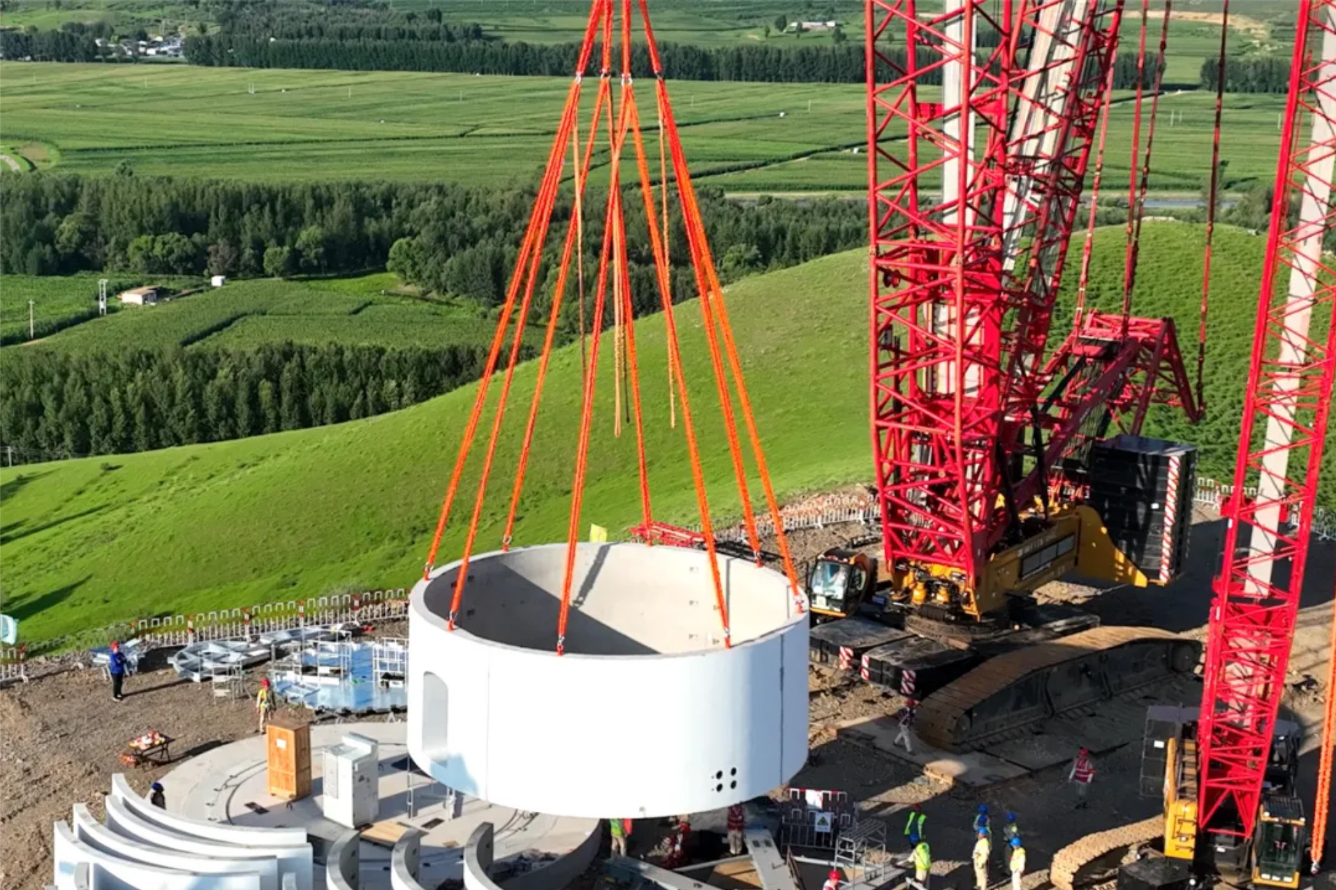 中国能建山西电建内蒙古赤峰克旗兴龙20万千瓦风电项目,完成全国首台最大单机陆上风电机组吊装。
