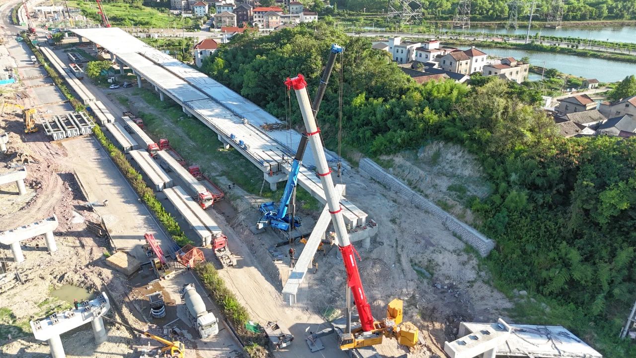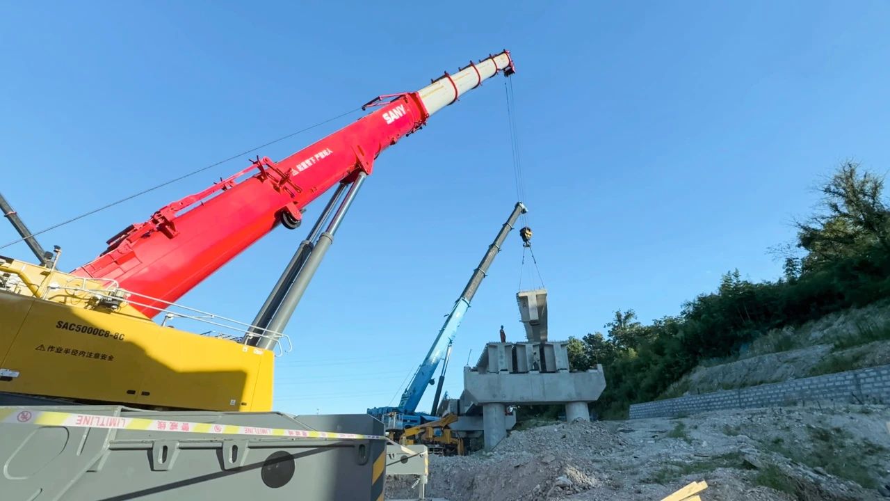 柯诸高速公路是杭州都市区环线高速公路(杭州二绕)的重要组成部分,为国家高速公路网和浙江省重点建设项目,将极大加强绍兴西南部地区与杭州的快速联系,提升绍兴市综合交通网络的服务水平。在柯诸高速项目03省道东复线施工中,好体育投注网站SAC5000C8-8C凭借其卓越的性能和技术,成为项目施工中的得力助手,与SAC3000T配合,展现了优秀的施工效率。25.9米跨距、 112吨配重搭配36.4米臂长,轻松完成了重39.4吨的T型梁架设任务。