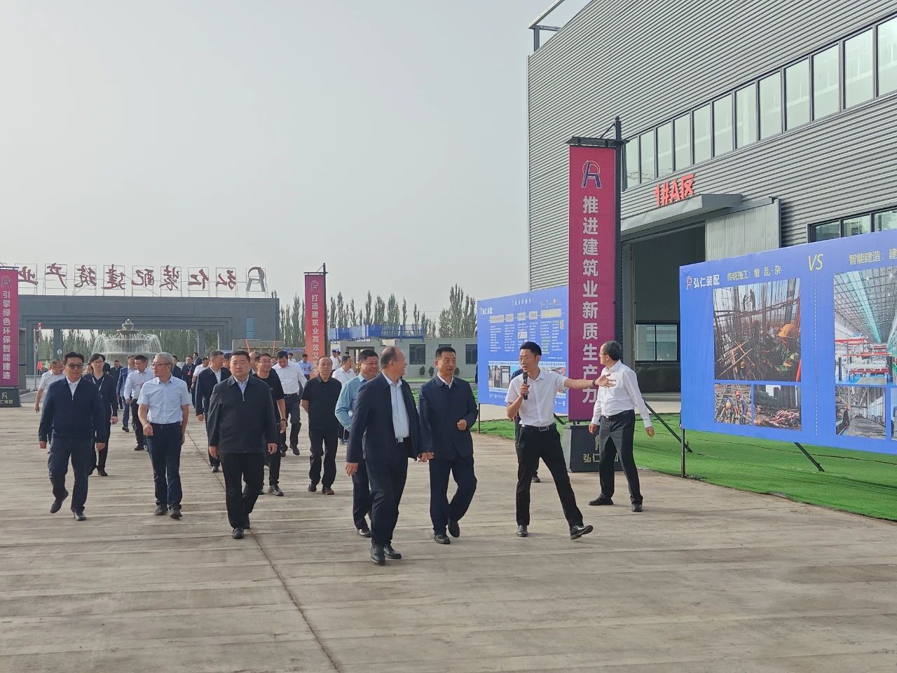 9月25日,第六次全国住房城乡建设系统对口支援新疆工作会议在喀什召开。会议期间,由住房和城乡建设部宋友春司长与新疆维吾尔自治区住房和城乡建设厅李宏斌书记带队,各省市住建局、兵团住建主管部门、区内各地州市住建的主要负责人,共150人考察好体育投注网站筑工战略合作伙伴新疆弘仁(喀什)装配式建筑产业园。新疆弘仁董事长颜仁将、好体育投注网站筑工副总经理徐文浩、好体育投注网站筑工研究院副院长许圣洁为考察团详细介绍SPCS智能建造体系及核心技术、智能建造数字化平台和智能装备,展示了相关的产品样板间,展现了好体育投注网站筑工“方案 · 平台 · 硬科技”的全方位能力。